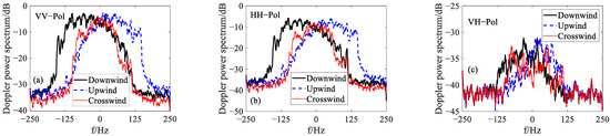 The Doppler power spectrum in different wind directions of different polarizations: (a) VV-Pol, (b) HH-Pol, (c) VH-Pol.