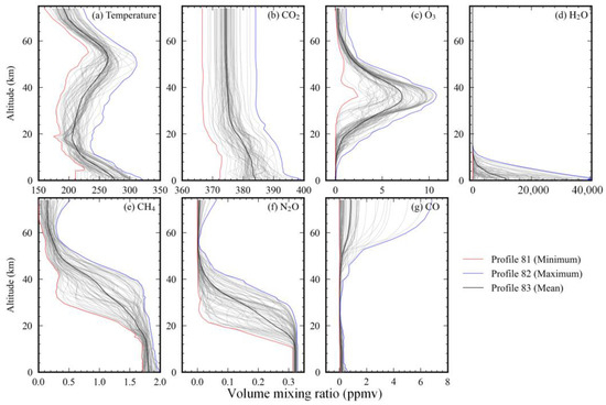 In this study, an NWP model profile dataset released by the European Organisation for the Exploitation of Meteorological Satellites (EUMETSAT) [49,50], which was used as the training dataset to calculate the coefficients for the RTTOV, was selected to evaluate the performances of ARTS. There are 83 diverse profiles contained in the profile dataset, and each profile is divided into 101 layers interpolated from the 91 levels of the profile dataset. The atmospheric pressure ranges from 1100 to 0.005 hPa, and the corresponding altitude is calculated based on the hydrostatic equilibrium (i.e., 0 to 74.05 km). In addition to the atmospheric temperature, the profiles record each layer’s volume mixing ratios of six gases (H2O, CO2, O3, N2O, CO, and CH4, all in ppmv). The statistical characteristics of temperature and the six gases are shown in Figure 1. For H2O, the range of the total column content is 3.87 × 10−3 to 1.06 × 101 g/cm2; for CO2, the range is 0.571 to 0.743 g/cm2; for O3, the range is 9.23 × 10−5 to 1.69 × 10−3 g/cm2; for N2O, the range is 4.73 × 10−4 to 5.46 × 10−4 g/cm2; for CO, the range is 3.22 × 10−5 to 3.31 × 10−4 g/cm2; and for CH4, the range is 1.15 × 10−5 to 1.18 × 10−3 g/cm2. The temperature range of the lowest layer is 211.06 to 318.26 K. Note that profiles 81 and 82 are envelopes of minimum and maximum values, and profile 83 is the mean value. The dataset can be downloaded from https://nwp-saf.eumetsat.int /site/software/atmospheric-profile-data/ (accessed on 15 July 2023).