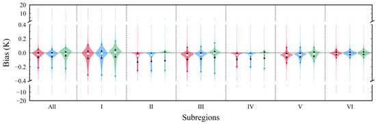 It can be seen that more than 90% of the sample differences were distributed within ±0.5 K, and there was a slight systematic underestimation (−0.04 K at 0° and −0.02 K at 60°) at the all-grid level. There were higher differences in subregions I and III, especially in subregion I, than in subregions II, IV, V, and VI. The highest agreement between ARTS and LBLRTM was obtained in subregion VI, and no significant systematic bias was found. In addition, in subregions II and IV, the simulated BT of ARTS was generally lower than that of LBLRTM (more than 95% of the differences were lower than 0 K). These differences in distributions were wider in subregions I, III, and V, accompanied by a slight systematic underestimation.