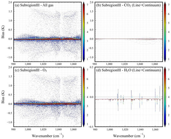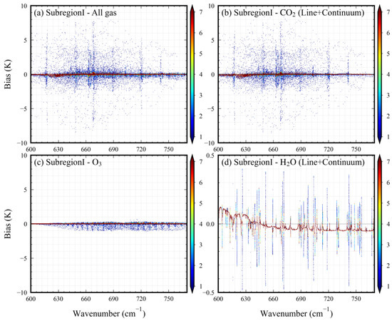 In addition, we found that in some subregions (especially in subregions II, III, and IV), the difference in the version of the H2O continuum led to lower ARTS single-gas BT simulation results. Taking subregion II as an example (see Figure A2c-II,d-II in Appendix B), when only the absorption lines were considered, the simulated BT difference did not show any systematic underestimation. However, when the continuum was introduced, systematic underestimation occurred. The reason for this is that the H2O continuum used by the LBLRTM changes the calculation method of temperature dependence to a power law, which is also the reason for the slight systematic underestimation at the all-grid level. However, the order of the systematic underestimation was 0.1 K and could become smaller when other absorption gases (e.g., CO2 and O3) are introduced. For CO2, whether or not the continuum is considered has no significant impact on the distribution of BT differences (see Figure A2a-I–b-I).
