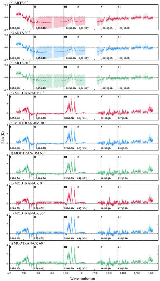 BT differences between (a–c) ARTS, (d–f) MODTRAN-BM, and (g–i) MODTRAN-CK and LBLRTM on AIRS channels. The values outside/inside brackets represent the MBD/RMSD of each subregion, and the unit is K.
