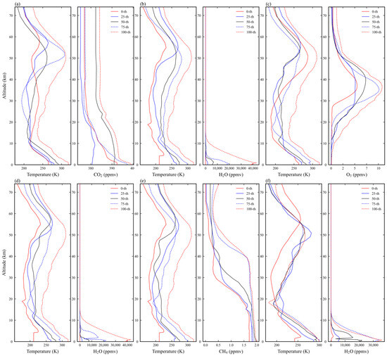 The distribution of (a) atmospheric temperature and (b–g) six gases of the 83 profiles as a function of altitude.