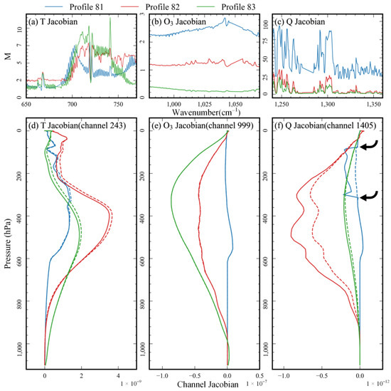 In this study, the Jacobians (including temperature, ozone, and water vapor Jacobians) of LBLRTM and ARTS were calculated using the analytical method. In Figure 7, we show the M values of profile 81 to 83 at 0° for the temperature Jacobian in subregion I, the ozone Jacobian in subregion III, the water vapor Jacobian in subregion V, and the channel (i.e., channel 243, 999, and 1405) Jacobians corresponding to the maximum M value in the three subregions. For the temperature Jacobian, all M values were below 12, and over 50% were below 5. On channel 243, the Jacobians calculated by the LBLRTM and ARTS experienced similar changes in their vertical structure, but the Jacobian of ARTS was higher than that of LBLRTM at 50–600 hPa. For the ozone Jacobian, the two models were incredibly close (M values are all below 5). For the water vapor Jacobian, few M values were less than 5, indicating a non-negligible difference between the Jacobian calculated by ARTS and LBLRTM. On channel 1405, the most significant difference appeared in profile 82, and the smallest difference appeared in profile 81, which indicated that the more significant Jacobian difference occurred in the humid atmosphere. However, we found an abnormal phenomenon, i.e., a huge difference in the water vapor Jacobian between ARTS and LBLRTM in the 88–300 hPa of profile 81. After investigation and analysis, we found that the reason for this was the extremely low value (0.016 ppmv) of the volume mixing ratio of water vapor in the 88–300 hPa. From the variation in vertical structure, the water vapor Jacobian calculated by ARTS was more physical than that of LBLRTM, and abnormal mutations appeared in the LBLRTM water vapor Jacobian.