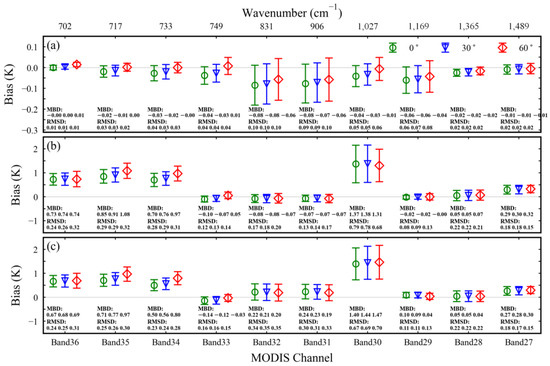 For an assessment of the MODIS channels, the simulated results of the four RTMs were convolved with the MODIS spectral response functions to obtain the corresponding BTs of the MODIS channels, and the results are shown in Figure 8. It is easy to conclude that ARTS had the highest agreement with LBLRTM compared to MODTRAN-BM and MODTRAN-CK. At the all-channel level, the MBDs of ARTS ranged from −0.04 to −0.02 K at three angles, with RMSDs of 0.07 K. The corresponding MBDs of MODTRAN-BM were 0.37 to 0.44 K, and RMSDs were 0.69 to 0.74K. The corresponding values of MODTRAN-CK were 0.40 to 0.47 K and 0.66 to 0.74 K.