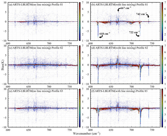 It is clear that the gases affected by line mixing include CO2 [65,66] and CH4 [67,68]. The ratio of CO2 absorption lines affected by line mixing was 74.6%, while that of CH4 was 0.3%. We found that the line mixing of CH4 caused little difference to the simulation, and this difference was further reduced after convolution with the instrument response (e.g., an order of 0.1 K for the AIRS channel within 1200–1400 cm−1). The ΔBTNLM and ΔBTLM for profiles 81 to 83 at 0° in subregion I (for CO2) are shown in Figure 9. As mentioned in Section 2.1, profiles 81 and 82 were envelopes of minimum and maximum values, and profile 83 was the mean value. In other words, profile 81 is an extremely cold and dry atmosphere, and profile 82 is an extremely humid and hot atmosphere. It can be found that the wavenumbers affected by CO2 line mixing were mainly distributed around 618, 667, 722, and 742 cm−1. At around 618, 722, and 742 cm−1, CO2 line mixing led to a higher simulated BT, which caused the ΔBTLM to appear negative (up to −10 K). However, a contrary phenomenon emerged at around 667 cm−1, and ΔBTLM was below 5 K.
