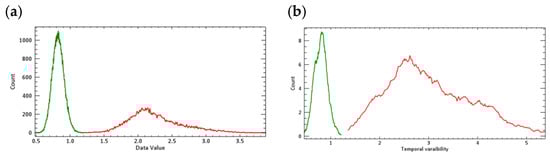 Frequency distribution of temporal standard deviation of stable forest (green line) and deforested areas (red line) for (a) Iguazu and (b) Brăila.