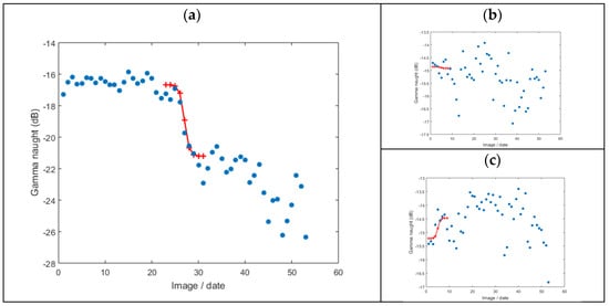 (a) Backscatter intensity (gamma-naught) as a function of the image /date (blue dots) overlaid with the fitted logistic function (red line); (b) flat logistic curve and (c) inverted logistic curve.
