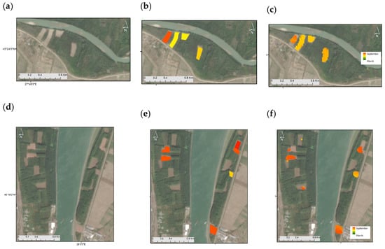 Reference data and colored pixels as a function of the estimated deforestation date for the two areas in Brăila (shown as red rectangles in Figure 1). The first column (a,d) shows the multispectral Sentinel-2 image acquired in September 2021. The second column (b,e) shows the reference plots colored according to the reference date. The third column (c,f) shows the detected deforested pixels colored according to the estimated date. The color scale is linear and ranges from January 2019 (dark green) to December 2021 (dark red).