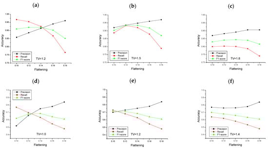 Deforestation detection accuracy as a function of the temporal variability and flattening. The first row shows the results for Iguazu with increasing temporal variability: (a) 1.2; (b) 1.5 and (c) 1.8. The second row shows the results for Brăila with increasing temporal variability: (d) 1.0; (e) 1.2 and (f) 1.4.