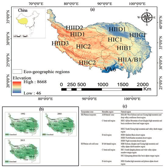 The location of the TP and spatial distribution of eco-geographic regions and grasslands. (a) Location of the Tibetan Plateau in China; (b) distribution patterns of grasslands on the Tibetan Plateau in 1992, 2005, and 2015; (c) ecogeographic divisions summarized in the table.