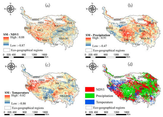 Partial correlation coefficients between (a) NDVI, (b) precipitation, (c) temperature and SM from 1982 to 2015, and (d) dominant factors influencing SM.