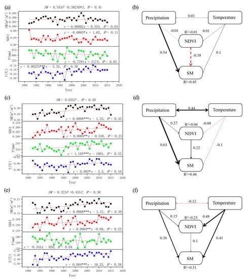 Multiple stepwise linear regression is one of the most commonly used multiple linear regression models that can solve the multicollinearity problem and select a more streamlined combination of effective variables to construct the model. NDVI, precipitation, and temperature were used as inputs to the multiple stepwise linear regression model to reveal the influence of these elements on SM, and their standardized regression coefficients can be used to characterize the magnitude of the impact intensity []. According to the criteria of ecogeographic zoning, HIIA/B1 and HIB1 were considered as wet zones; HIC1, HIC2, HIIC1, and HIIC2 as semi-arid zones; and HID1, HIID1, HIID2, and HIID3 as arid zones. As can be seen from Figure 5, the variation of soil moisture in the humid zone with interannual is not significant, while NDVI and temperature show significant decreasing and increasing trends, respectively. The variation of SM can be explained by the dynamic response with precipitation and NDVI. The positive correlation between precipitation and SM implies that the presence of the phenomenon of precipitation reduction in the humid areas caused a decrease in soil moisture. The vegetation greenness reflects the vegetation growth activity to a certain extent, and the reduced activity reduces the consumption of soil moisture by vegetation and facilitates the accumulation of soil moisture. The increase in SM caused by the decrease in NDVI and the decrease in SM caused by the decrease in precipitation offset each other, which finally contributed to the situation of no significant change of soil moisture in the humid zone. However, the extremely low correlation between the changes in vegetation NDVI and precipitation and temperature may be due to the disorderly variation of precipitation and temperature, and the very small correlation coefficient between precipitation and temperature verifies the existence of this disorderly state. In the semi-arid region, SM, NDVI, precipitation, and temperature all showed significant increasing trends. From the regression relationship, it can be concluded that precipitation has a significant contribution to the growth of SM. The increase in precipitation promotes the vegetation activity to a certain extent, which brings the increase in NDVI. Meanwhile, the remaining precipitation was used to replenish the soil, causing a significant increase in soil moisture. SM, NDVI, and temperature in arid areas showed significant increases from 1982 to 2015, while precipitation showed a non-significant decrease. The significant increase in temperature brought about an increase in soil moisture, which may be due to the fact that the arid zone is located in a cold area at high altitude, where the increase in temperature favors soil freezing and thawing and releases moisture [].