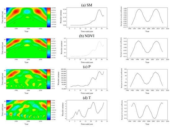 The wavelet analysis can reflect the periodic change pattern of the study object, and the results are shown in Figure 6. The multi-timescale characteristics of the evolution of SM, NDVI, precipitation, and temperature on the TP over the years can be clearly seen. In general, the evolution of SM mainly has a cyclic variation pattern of 25–30 a, and NDVI has a cyclic variation of 20–30 a. The periodic variations of precipitation and temperature are more complicated, with 5–10 a and 20–32 a periodic variations of precipitation. The period of temperature varying is then 5–12 a and 15–25 a. On the time scale of 20–30 a, there are quasi-2 oscillations with alternating high–low value changes in SM, NDVI, and precipitation. More specifically, the period variation of precipitation at time scales below 10 a is rather heterogeneous, indicating that the annual precipitation on the TP varies frequently and less regularly under small-scale cycles. According to the analysis of the results of wavelet variance, the time series of SM has the strongest oscillation in the cycle around 28 a in the last 34 years, while there are oscillation cycles of 22 a and 28 a for NDVI and precipitation, of which 28 a is the first main cycle of variation. However, the oscillatory changes of temperature are more complicated, with oscillatory cycles of 6 a, 9 a, 16 a, and 22 a. Figure 6a–c—right) shows that the average variation period of SM, NDVI, and precipitation is about 18 years on the time scale of 28 a, and about 2 cycles of high-low transition, while it can be predicted that the SM, NDVI, and precipitation in the humid zone will experience a short decrease in the short period after 2015, and then enter into an accelerated increase. However, the complex cyclic variation of temperature results in an average variation period of about 15 years on a time scale of 22 a, with about 2 cycles of warming–cooling transition. From Figure 6d—right, the contours of the most significant cycle of temperature in 2015 are not closed, which indicates that the temperature of the TP will continue to be high after 2015. The similar cycle changes between SM, NDVI, and precipitation may lead to a more obvious positive correlation between SM and NDVI and precipitation, as in Figure 6d, while the non-contemporaneous changes between temperature and SM, NDVI, and precipitation make the correlation between temperature and SM weaker.