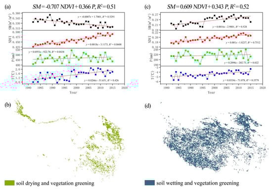Changes in annual mean precipitation (P), temperature (T), NDVI, and SM in the (a) soil drying and (c) soil wetting zones from 1982 to 2015. The stepwise regression equation for SM is shown at the top of Figure 7. (b,d) are the spatial distribution of soil drying and soil wetting zones, respectively.