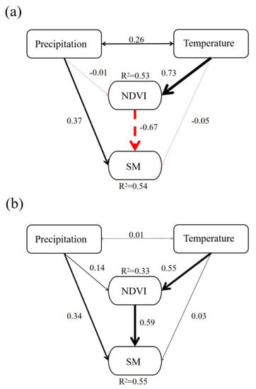 Results of structural equation modeling of the relationship between NDVI, precipitation, temperature, and SM in the (a) soil drying zone and the (b) soil wetting zone. A solid black line indicates a positive coefficient, a dashed red line indicates a negative coefficient and the thickness of the line indicates the absolute value.