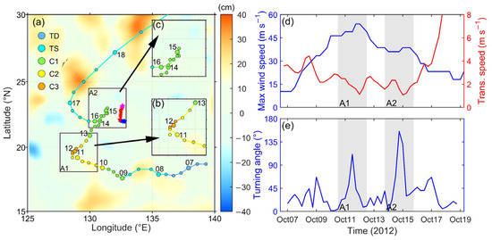 The evolution of the SSHA before, during, and after the passage of Prapiroon is shown in Figure 3. Before Prapiroon (averaged on 1–3 October; Figure 3a), to the south of 23°N, there were no obvious cold or warm eddies along the typhoon’s track. At approximately 129°E, 25°N and 134°E, 29°N, there were two warm eddies existing pre-typhoon. Over the two domains, A1 and A2, on which we focused during the sudden-turning stages of Prapiroon in the present study, no obvious pre-typhoon warm or cold eddies occurred, indicating that the enhanced SST cooling could not be attributed to the modulations of cold core eddies, as previous studies mentioned [28].