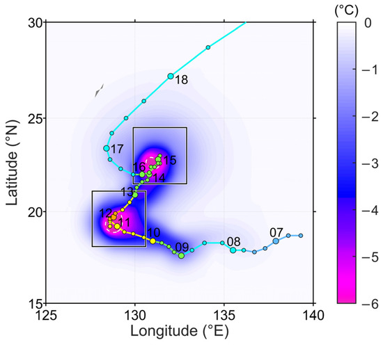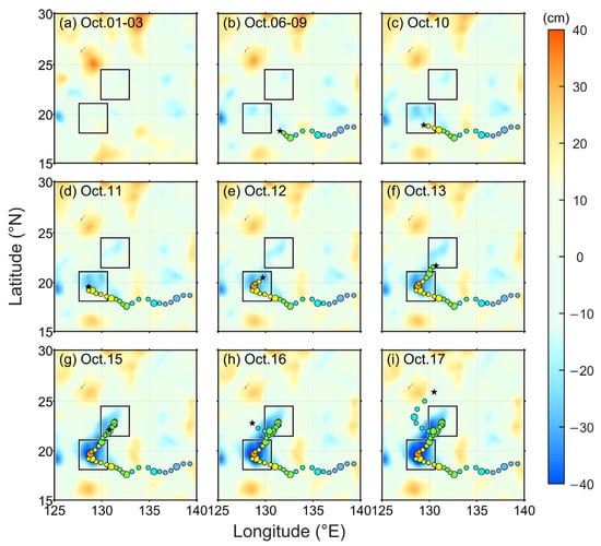 On 6–9 October, when Prapiroon moved westwards along a straight-line track, the TC-induced SSHA reduction was smaller than −10 cm (Figure 3b). When Prapiroon suddenly turned northwards and affected the A1 domain (Figure 3c), the SSHA located north of the typhoon’s track in the A1 domain had a significant reduction, which was attributed to Ekman pumping and the divergence generated by the cyclonic wind stress of Prapiroon [4]. On 12 October, when the typhoon was directly over the A1 domain, just after its first sudden turning (A1-ST), the local SSHA decreased from a neutral condition to −31 cm, and the largest SSHA reduction in the A1 domain was −38 cm. Since the SSHA change usually lagged compared with the SST, the SSHA in the A1 domain continued to decrease after TC passage and reached a minimum of −58 cm, with a maximum SSHA reduction of −54 cm on 18 October (not shown in the figure).
