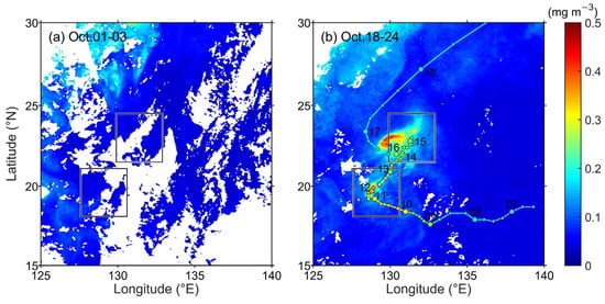 To investigate the biophysical response to Typhoon Prapiroon, we examined the chlorophyll-a concentration during Prapiroon’s passage. The dataset was obtained from GlobColour (https://hermes.acri.fr/index.php?class=archive, accessed on 1 April 2022). The datasets of GlobColour were measured by the following sensors: SeaWiFS, MODIS AQUA, MERIS, VIIRS NPP, VIIRS JPSS-1, OLCI-A, and OLCI-B, and they supplied the daily, 8-day, and monthly products. The GlobColour products include the single-sensor measure products and merged products. In this study, the chlorophyll-a concentration calculated by the algorithm of Gohin (c.f. OC5), based on the MODIS observations, were employed. The temporal resolution of the Chl-a concentration data is 1 d, with a spatial resolution of 4 km.