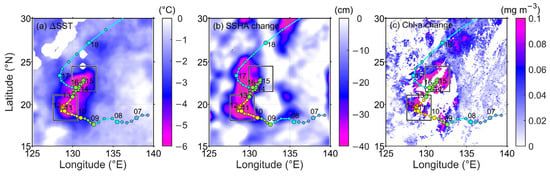 The spatial distribution of maximum SSHA reduction was similar to that of SST cooling (Figure 5b), with the maximum changes in SSHA also appearing in the A1 (−54 cm) and A2 (−58 cm) domains. Nevertheless, due to the continuous westward propagation of the SSHA anomaly associated with the cold core eddies that emerged after the typhoon [57], the regions with remarkable SSHA reduction did not exactly coincide with those of SST cooling but were somewhat westwards. Although the Chl-a concentration was somewhat missed due to heavy clouds over the widely spread influenced region by TCs, Figure 5c still clearly shows that, consistent with the spatial distribution of maximum SST cooling and SSHA reduction, the most remarkable increase of Chl-a concentration also occurred in the A1 (0.31 mg m−3) and A2 (0.35 mg m−3) domains, wherein Prapiroon underwent two sudden turnings.