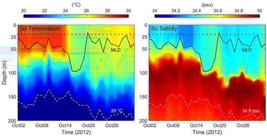 Temporal evolution of temperature and salinity profiles measured by Argo Float 5901989 in October 2012. (a) Temperature evolution; and (b) salinity evolution. The black solid lines represent the mixed layer depth (MLD). The white dotted lines represent the 20 °C isotherm in (a) and 34.9 psu isohaline in (b). The blue, red, and pink stars represent the profiles of Argo observations before, during, and after Prapiroon’s passage, respectively.