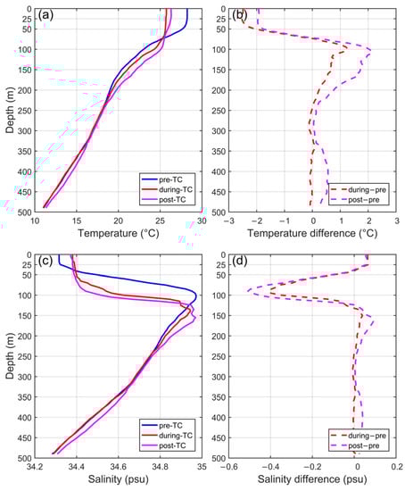 Temperature and salinity profiles measured by Argo Float 5901989 before, during, and after the passage of Prapiroon and their difference from the pre-typhoon profiles. (a) Temperature profiles; (b) temperature difference; (c) salinity profiles; and (d) salinity difference. The blue, red, and pink lines represent the average profiles before, during, and after Prapiroon’s passage, respectively. Red (pink) dotted lines indicate the difference between during-typhoon (post-typhoon) and pre-typhoon profiles.