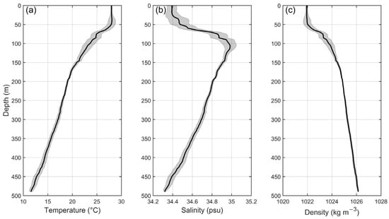 Initial temperature, salinity, and density profiles as the initial conditions of the three-dimensional Price–Weller–Pinkel (3DPWP) model. (a) Temperature profile; (b) salinity profile; and (c) density profile. The thick black lines represent the average of the Argo temperature, salinity, and density profiles on 7–9 October. The shadings represent the error bars of the 95% confidence intervals.