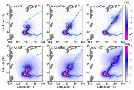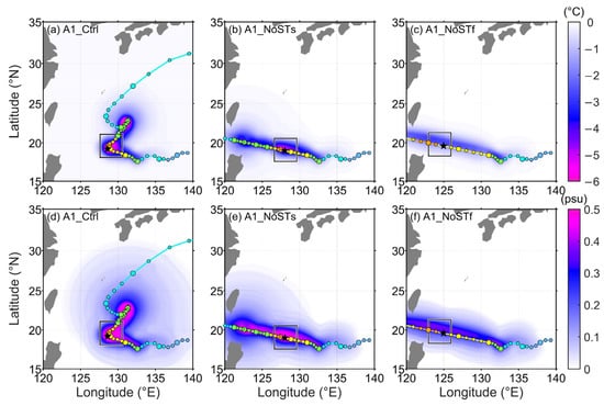 In Figure 13, the results during the A2-ST stage were similar to those during the A1-ST stage. The SST of Experiment A2_Ctrl decreased from 28 °C to 22 °C, with an SST cooling of 6 °C (Figure 13a). In Experiments A2_NoSTs and A2_NoSTf, the SST cooling decreased, in turn. After the passage of Prapiroon, the SST decreased to 25 and 26 °C, respectively, with an SST cooling of 3 and 2 °C (Figure 13b,c). In Experiment A2_Ctrl, the 18 °C isotherm uplift was 128 m (from 239 m to 111 m), while in Experiment A2_NoSTs and A2_NoSTf, these were 51 m (from 239 m to 188 m) and 29 m (from 239 m to 210 m), respectively, which were 77 and 99 m less than that of Experiment A2_Ctrl. As there was a nearly 180° sudden turning during the A2-ST stage (at 0000 UTC 14 October, Prapiroon moved to the northeast and then returned to the southwest at 1800 UTC 14 October, and the tracks on 14 October and 15 October were generally coincident), the upwelling was obviously greater than that during the A1-ST stage (there was a nearly 100° sudden turning). Corresponding conclusions could also be drawn from the salinity changes shown in Figure 12d–f and Figure 13d–f. The magnitude of SSS salinification in Experiments A2_NoSTs and A2_NoSTf decreased, in turn. In addition, the signal of salinity reduction could be clearly seen near a depth of 100 m.