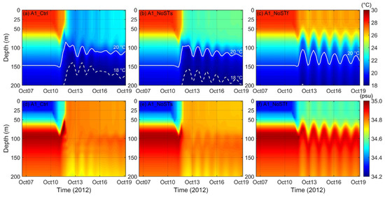 Temporal evolution of the temperature and salinity profiles in the 3DPWP experiments. (a) Temperature evolution in Experiment A1_Ctrl; (b) temperature evolution in Experiment A1_NoSTs; (c) temperature evolution in Experiment A1_NoSTf; (d) salinity evolution in Experiment A1_Ctrl; (e) salinity evolution in Experiment A1_NoSTs; and (f) salinity evolution in Experiment A1_NoSTf. The white solid lines represent the 20 °C isotherm. The white dotted lines represent the 18 °C isotherm.