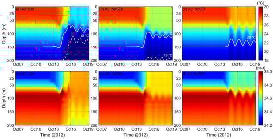 Temporal evolution of the temperature and salinity profiles in the 3DPWP experiments. (a) Temperature evolution in Experiment A2_Ctrl; (b) temperature evolution in Experiment A2_NoSTs; (c) temperature evolution in Experiment A2_NoSTf; (d) salinity evolution in Experiment A2_Ctrl; (e) salinity evolution in Experiment A2_NoSTs; and (f) salinity evolution in Experiment A2_NoSTf. The white solid lines represent the 20 °C isotherm. The white dotted lines represent the 18 °C isotherm.