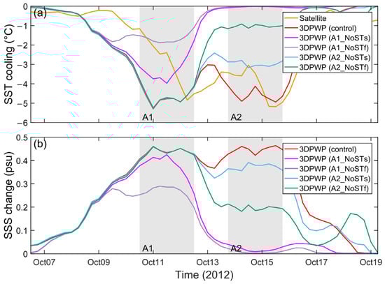 Temporal evolution of average SST cooling and SSS salinification averaged within 100 km of the typhoon centre in the 3DPWP experiments. (a) The evolution of SST cooling; and (b) the evolution of SSS salinification. The grey shaded areas indicate the A1-ST and A2-ST stages.