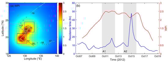 (a) Spatial distribution of the wind power index (WPi) caused by the passage of Typhoon Prapiroon. Two solid boxes are two focused domains of the sudden-turning stages of the typhoon, denoted A1 and A2. The coloured lines and dots represent the track and intensity of the typhoon. The black dotted lines indicate the −6 °C isotherm of maximum SST cooling in Figure 5a. (b) Temporal evolution of residence time (blue solid line) and WPi (red solid line) averaged within 100 km of the typhoon centre. The grey shaded areas indicate the A1-ST and A2-ST stages.