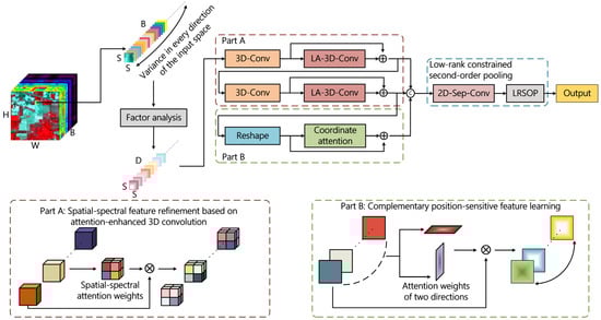 Facing the difficulties in fine-grained small sample hyperspectral classification, a framework based on low-rank constrained attention-enhanced multiple spatial–spectral feature fusion was designed in this paper. The aim of our research is to simplify the existing complex models, find out useful features with low redundancy, and make the best use of the extracted spatial–spectral embeddings. The proposed framework and main contributions are summarized as follows: