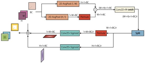 where represents the dimension reduced features, and the channel dimension is reduced to ; represents the convolution; represents the non-linear activation function, and H-Swish is adopted according to the literature []. It should be noted that the feature interaction in different directions is achieved since each spatial feature map of dimension shares convolution weights. Before the channel dimension is recovered, is separated into and along the spatial dimension, with dimensions and , respectively. The dimension of is adjusted to , keeping the same order as the initial pooling dimension. The and were then restored to their initial dimensions using two convolution layers, and the feature values were mapped to (0, 1) using the sigmoid activation function as the attention weights. The above calculation process is shown in the following equation:
