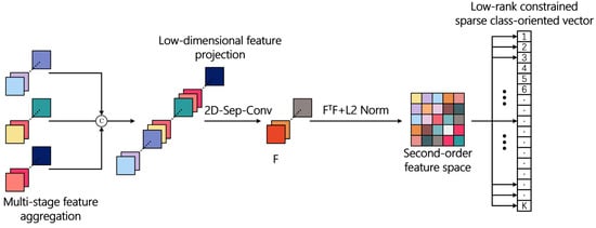 Inspired by the literature [,], this paper introduces a simple low-rank constraint on the spatial–spectral features. A compact low-dimension vector will be learned for each category based on the second-order features. The adopted low-rank constraint method can be seen as a simplification of the method in the literature [], and the diagram is shown in Figure 4.