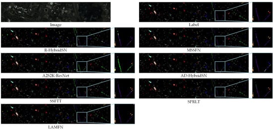In order to assess the effectiveness of the proposed model, several advanced deep learning models published in recent years were used as contrast models, including R-HybridSN [], MSSFN [], A2S2K-ResNet [], AD-HybridSN [], SSFTT [], and SPRLT []. The above contrast models can be broadly classified into three categories and will be briefly described as follows: