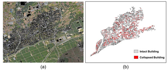 (a) OSM Building footprints in Mashiki town study area marked on Google Earth image. (b) Manually extracted building damage map for Mashiki town study area. The intact and collapsed buildings are displayed in gray and red color, respectively.