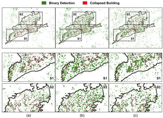 The damage detection map (green) derived from (a) intensity difference method, (b) GLCM-PCA method, and (c) proposed LTCHD method (Top: study area Mashiki town, Middle: S1 zoom areas, Bottom: S2 zoom areas). Red polygons denote reference building damages.
