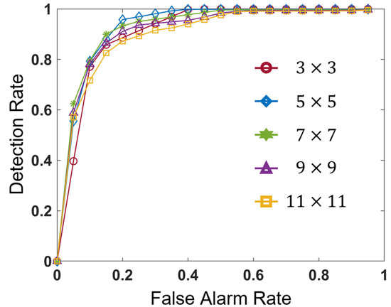 The ROC curve of detection results obtained from different window sizes ranging from 3 × 3 to 11 × 11 on the proposed texture-based method.