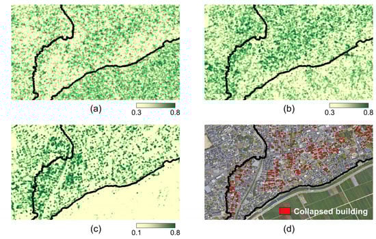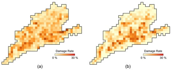 In Section 4, grid-based accuracy evaluation was performed by assuming that grid cells with a damage rate, i.e., the ratio of the damaged pixels to the total pixels in the grid cell, greater than 10% were damaged grids. Although a binary decision was made on grid cells for quantitative evaluation, the decision criteria for the number of damaged pixels had to be set empirically and may vary depending on urban structures. In this section, damage detection performance was qualitatively evaluated using the damage rate value, instead of making a binary decision for a grid cell. Figure 10a shows the damage rate calculated with the proposed LTCHD method. For comparison, the damage rate derived from the reference damage map is shown in Figure 10b. The overall spatial pattern of SAR-based damage rates exhibited good agreement with the areal damage rates derived from the reference damage map. Both data showed a similar spatial pattern in which more damaged pixels were distributed along the southern boundary of Mashiki town and the number of damaged pixels decreased toward the northeast of the town.