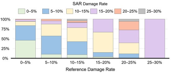 To effectively compare the relationship between the SAR-based damage detection and the reference damage map, the damage rates were classified into six damage categories at 5% intervals. The ratios of SAR-based damage categories corresponding to each reference damage category are plotted on the stacked bar graph as shown in Figure 11. Although the two damage rates did not match perfectly as can be inferred from the previous accuracy analysis, the overall trend between the damage levels was highly correlated. As the reference damage rate increases, the ratio of categories with low SAR-based damage rates decreases, and the ratio of categories with high SAR-based damage rates increases. In addition, we can also identify specific patterns of damage levels that can be inferred to be attributed to the inherent characteristics of the SAR signals. The SAR-based damage rate overestimated grid cells with less actual damage, which can be attributed to the changes in SAR signals caused by speckle effects and other natural variations. In addition, since the pixel area corresponding to the building can be smaller than the actual building footprint in the side-looking geometry of the SAR image, the degree of damages in the SAR-based detection results underestimated approximately 10% of the areal damage levels in the severely damaged area.