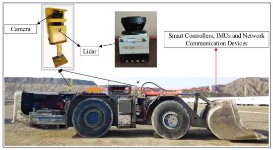 The first generation of autonomous guided vehicles for underground mines was developed in the early 1960s, 1970s, and 1980s [,]. These vehicles primarily assist navigation by drawing lines on the floor or lights on the roof. A CCD camera was used to detect the relative position of the straight line directly above or ahead of the vehicle. With the development of technology, vehicle navigation techniques have been mainly divided into two categories. The first category is absolute navigation. The vehicle knows its real-time position in a fixed co-ordinate system. A path is planned in this fixed co-ordinate system, and the vehicle follows this path. Absolute navigation is widely used in indoor and outdoor mobile robots, and simultaneous localization and mapping (SLAM) is the most popular technique in absolute navigation [,]. The second category is reactive navigation. The vehicle does not need to know its position on the entire map, it should only know its relative position in the current visible environment, assisting vehicle navigation based on this relative position. In the past few decades, a large amount of software for autonomous driving in mines has been developed, such as AutoMine, MINEGEM, and the Scooptram automation system, and numerous experiments and applications have been carried out in many mines []. To date, reactive navigation is the most widely used technique in mines [,,,], and LiDAR has become the most widely used type of sensor in the underground environment [].