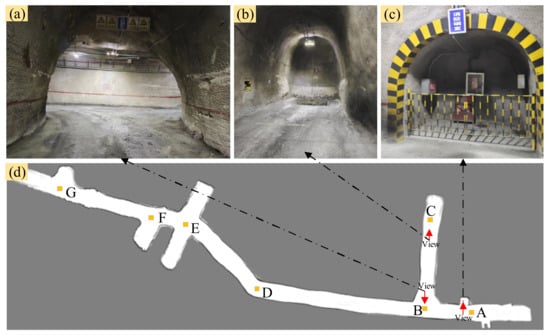 The laneway of Mine A for which dataset 1 was collected. (a) The view of the intersection; (b) the view of the orepass; (c) the view of the firefighting chamber; (d) the map. Note: (a–c) correspond to the views of the three red arrows in (d) respectively. A–G in (d) are the sampling points of the map.