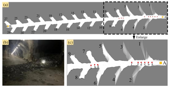 The laneway of Mine B for which dataset 2 was collected. (a) the map; (b) the view of the laneway; (c) a zoomed-in view of the map. Note: a–i in (c) are the sampling points of the map. A and B in (a) is the starting point and ending point of the laneway.