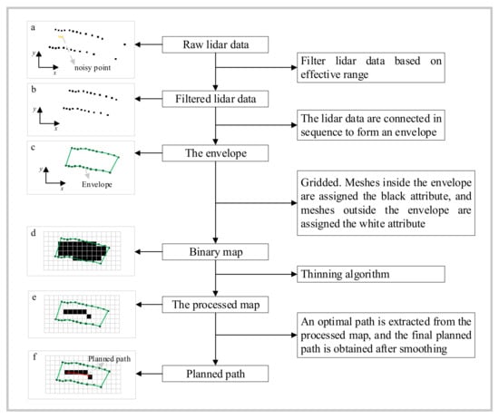 The main idea of our algorithm is to convert each frame of LiDAR data into a binary map, use a thinning algorithm to extract the skeleton of the map, and select a suitable polyline in the skeleton as the local planning path of the current frame. The flowchart of the proposed algorithm is shown in Figure 4.