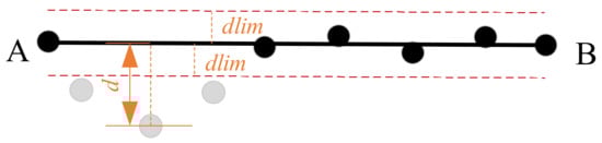 To enable the vehicle to run more smoothly, the raw local planning path needs to be smoothed []. In particular, if the current driving mode is straight, we wish to avoid the influence of the intersection in the laneway. We first use the following method for smoothing. The start and end points of the raw local planning path form a straight line. We calculate the distances from the other  points to the line except for these two points. If the distance of the point is greater than , we delete this point; otherwise, we keep this point. In Figure 5, A and B are the endpoints of the initial local planning path. The distance between the gray point in the figure and the straight line AB is greater than , which needs to be deleted, and other points are reserved. In this paper,  is taken as 0.3 m.