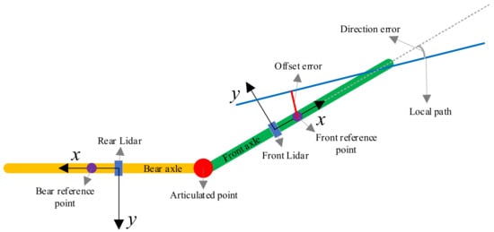 In this paper, the offset and direction error are used to quantitatively describe the accuracy of the algorithm. As shown in Figure 6, to calculate the error, we choose a point on the axle as a reference point. Here, we choose a point with a distance of 0.5 m along the LiDAR scan direction as the reference point. When the vehicle is moving forward, we use the front LiDAR, and when the vehicle is moving backward, we use the rear LiDAR. The distance from the reference point to the local planned path is the offset error. When the reference point is on the left side of the local planning path, the offset error is positive; otherwise, when the reference point is on the right side of the local planning path, the offset error is negative. The positive direction of the current X axis is used as the reference direction, and the difference between the direction of the local planned path and the reference direction is used as the direction error. The positive and negative direction error are consistent with the angle definition given in Section 3.3.