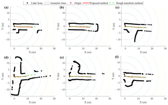 Figure 7 shows the local path planning of the proposed method and the method of the Hough transform in the straight-moving case in dataset 1. The LiDAR data collection positions of (a–f) correspond to the vicinity of points A, C, B, E, F, and G in Figure 2d, respectively. It can be seen that (1) in different situations, whether in the normal situation (Figure 7b), under the interference of the chamber (Figure 7a), or under the interference of the intersection (Figure 7c–f), the proposed method can accurately find the centerline of the current laneway. (2) The proposed method is consistent with the local path planning of the Hough transform. (3) The local path of the proposed method is a curve, which is consistent with the changing trend of the laneway, while the local path of the Hough transform method is a straight line.