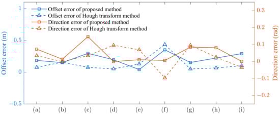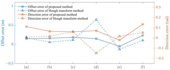 Figure 15 shows a quantitative evaluation of the results of Figure 14—that is, the evaluation of the offset and direction error of the two methods. The mean absolute offset error of the proposed method is 0.2093 m and the mean absolute direction error is 0.0466 rad. The average absolute offset error of the Hough transform method is 0.1271 m, and the absolute direction error is 0.0543 rad. To summarize, it can be concluded that the proposed method’s accuracy is comparable to the local path planning accuracy of the Hough transform method, and the errors are all within the allowable range.
