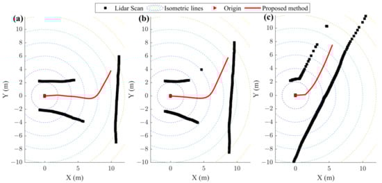 There are few studies on the local path planning method for the reactive navigation of underground vehicles. At present, the method based on the Hough transform [,] is the most up-to-date. This method was proposed by Larsson [] in 2008. The main idea is to detect whether two parallel lines satisfy certain constraints by performing the Hough transform on LiDAR data. If it exists, we solve the centerline of the two straight lines as the local planning path. If it does not exist, the path cannot be planned. The method is robust when the vehicle does not turn. However, this method cannot be used while turning. Therefore, we only compare this method with the method proposed in this paper in the straight-line mode.