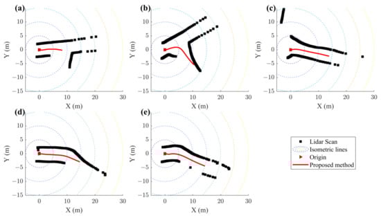Figure 10 shows the local path planning of the proposed method in the case of the right turn in dataset 1. The LiDAR data collection position of Figure 10a–c corresponds to the turning path of A-B-C in Figure 2, and the LiDAR data collection position of Figure 10d,e corresponds to the vicinity of point D in Figure 2. Looking at Figure 10a–e, as in the case of a left turn, it can be seen that as the LiDAR’s visible curve area increases, and the local path planning moves closer to the road centerline. The local path planning errors in Figure 10a–e are shown in Table 2. The absolute average offset error of the local path planning for the proposed method is 0.1892 m, and the absolute average direction error is 0.1395 rad.